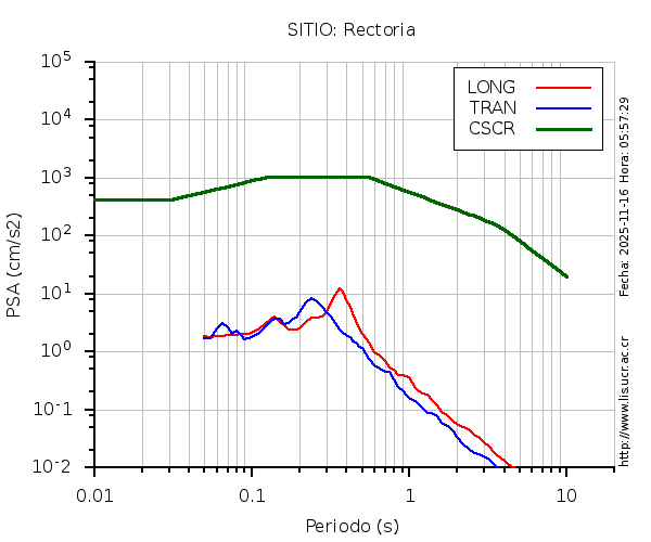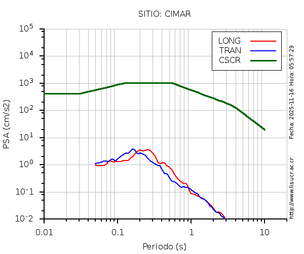 En los siguientes gráficos, la traza verde es el espectro propuesto por el CSCR-2010, la traza roja es el espectro de este sismo en la componente LONGITUDINAL y la traza azul la componente TRANSVERSAL. El valor de la amplitud está dado en pseudoaceleración en gales ó cm/s2.