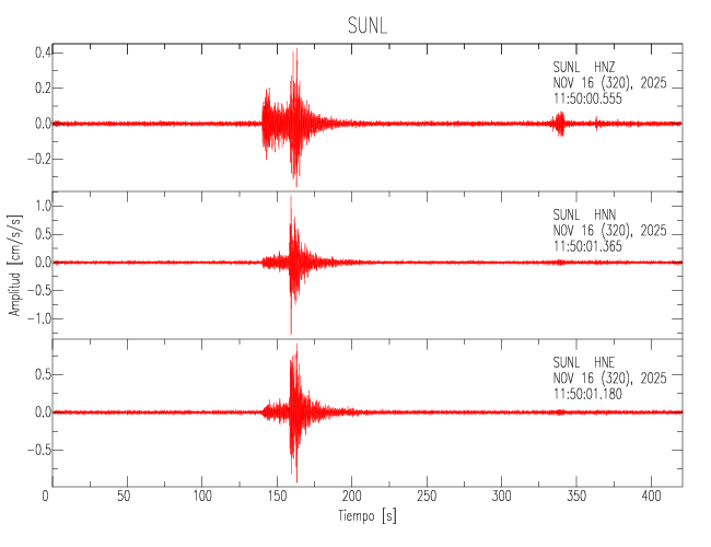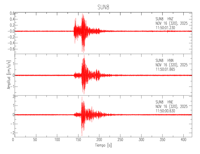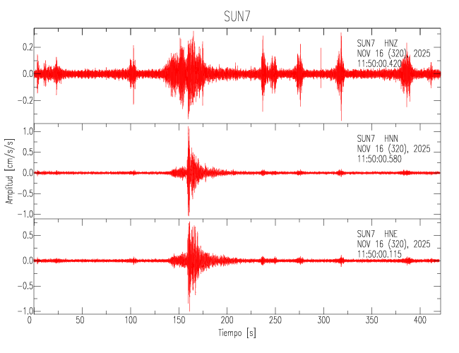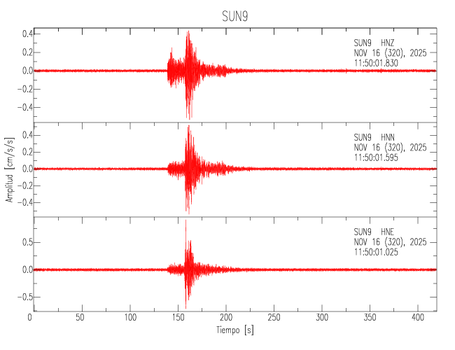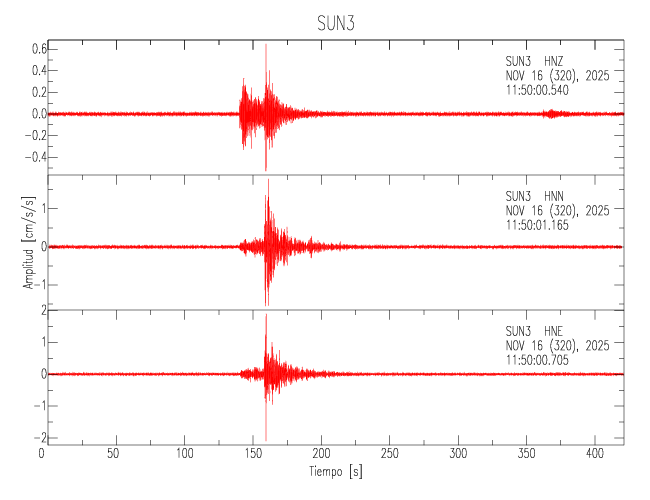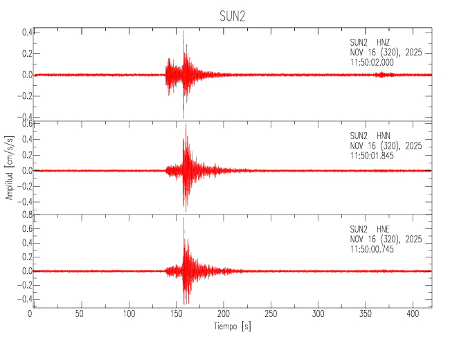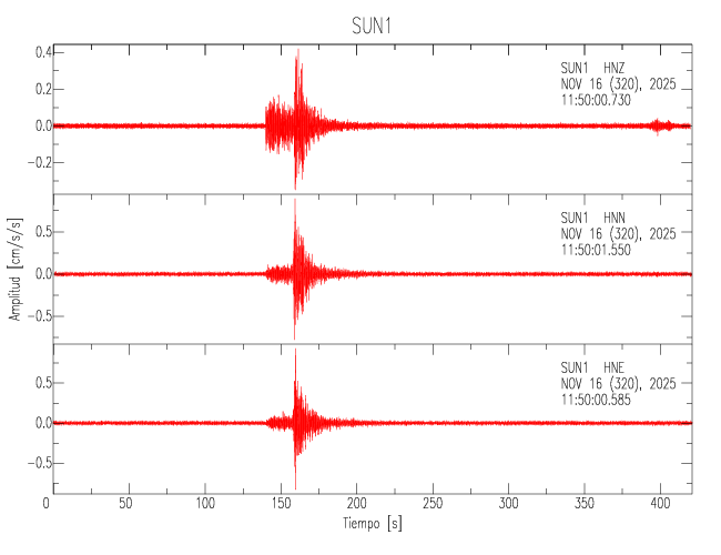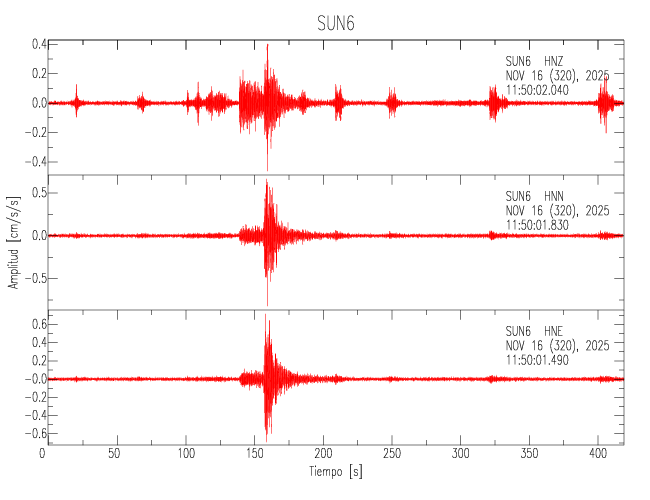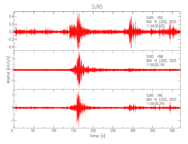 Gráficos de las trazas de aceleración en las 3 componentes: LONGITUDINAL, TRANSVERSAL y VERTICAL de cada uno de los sitios de la Sede Central.
