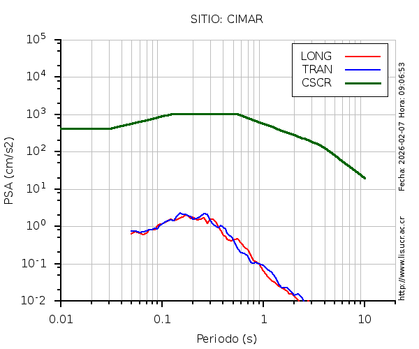 En los siguientes gráficos, la traza verde es el espectro propuesto por el CSCR-2010, la traza roja es el espectro de este sismo en la componente LONGITUDINAL y la traza azul la componente TRANSVERSAL. El valor de la amplitud está dado en pseudoaceleración en gales ó cm/s2.