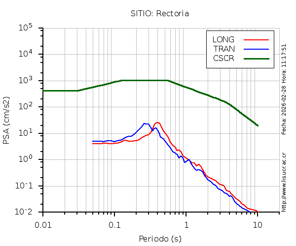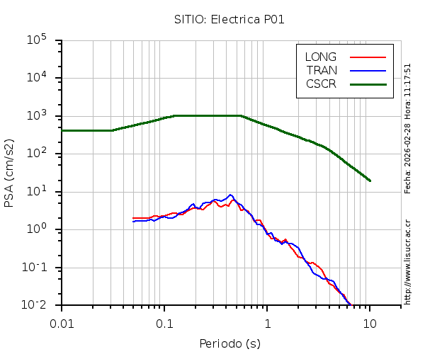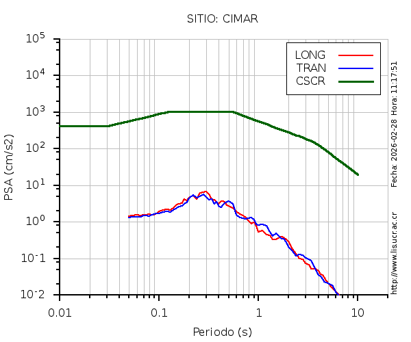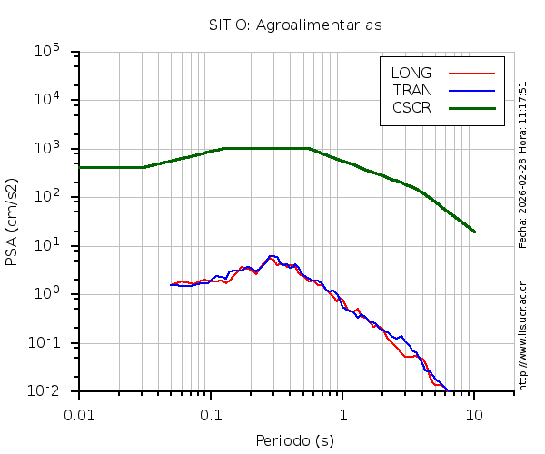 En los siguientes gráficos, la traza verde es el espectro propuesto por el CSCR-2010, la traza roja es el espectro de este sismo en la componente LONGITUDINAL y la traza azul la componente TRANSVERSAL. El valor de la amplitud está dado en pseudoaceleración en gales ó cm/s2.