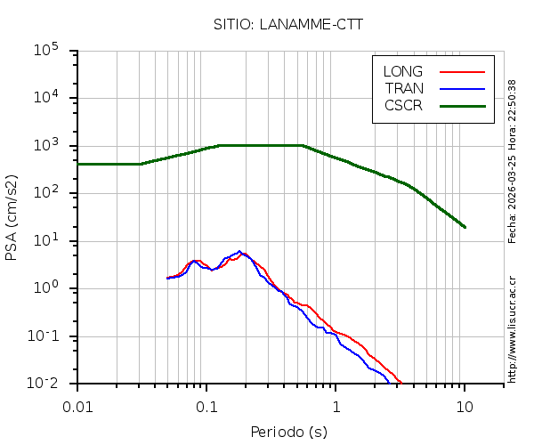 En los siguientes gráficos, la traza verde es el espectro propuesto por el CSCR-2010, la traza roja es el espectro de este sismo en la componente LONGITUDINAL y la traza azul la componente TRANSVERSAL. El valor de la amplitud está dado en pseudoaceleración en gales ó cm/s2.