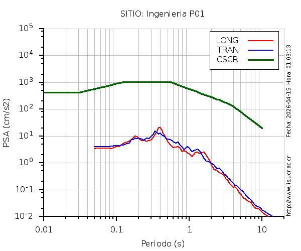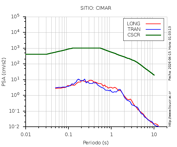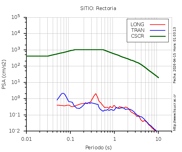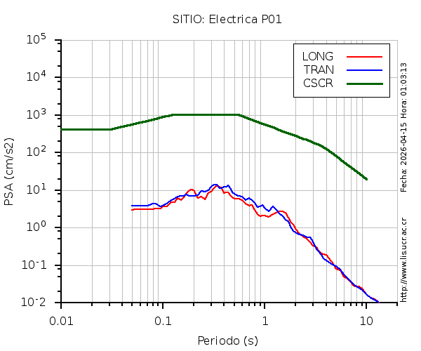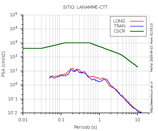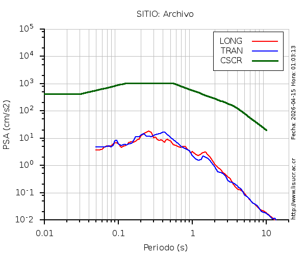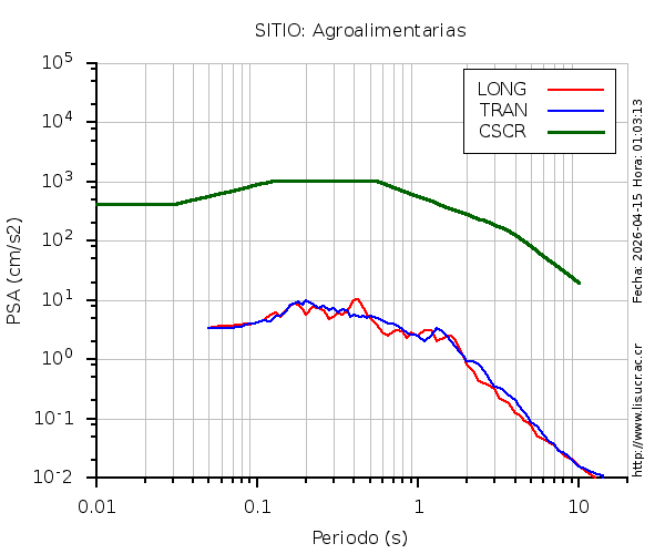 En los siguientes gráficos, la traza verde es el espectro propuesto por el CSCR-2010, la traza roja es el espectro de este sismo en la componente LONGITUDINAL y la traza azul la componente TRANSVERSAL. El valor de la amplitud está dado en pseudoaceleración en gales ó cm/s2.