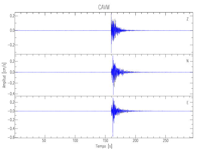Los registros de velocidad se obtienen de la integración de los datos de aceleración. Esta tabla contiene los valores de velocidad máxima (PGV por sus siglas en inglés) para cada componente en cm/s. Las estaciones se listan en orden alfabético y corresponden a los sitios en que el nivel de aceleración fue superior a los 5 cm/s2.