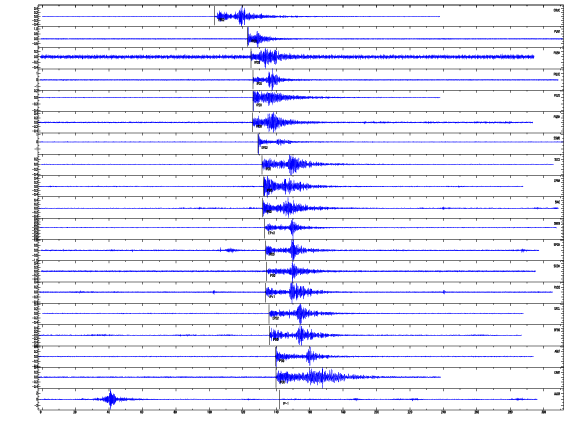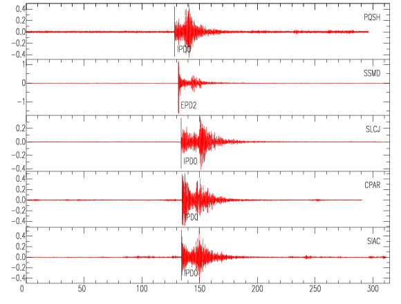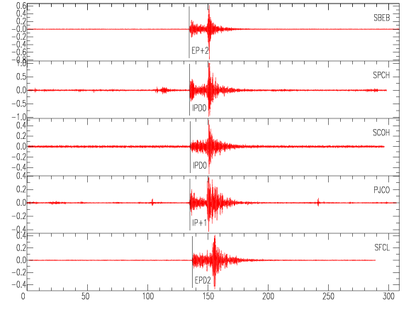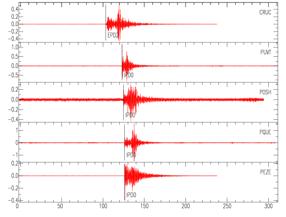 Mapa del epicentro: Los triángulos verdes son las estaciones acelerográficas usadas para calcular el epicentro que se muestra como un punto amarillo. El detalle de la magnitud y distancia a San José se muestra en el cuadro inserto en el mapa.