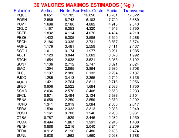 La siguiente tabla muestra los datos de aceleración máxima para cada componente en porcentaje de la aceleración de la gravedad (%g). Estos se obtienen dividiendo el valor del PGA registrado por 980 cm/s2 y multiplicándolo por 100. Los valores de las últimas dos columnas corresponden a la componente radial y transversal. Los datos se listan en orden descendente según el valor de la componente radial.