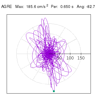 Tomando el periodo en el cual se presenta la amplitud máxima del espectro de respuesta máxima para cada estación, se representa la respuesta bidireccional en función del tiempo sobre el plano horizontal. Se identifica el punto (color verde en cada figura) del cual se desprende la orientación mostrada en el mapa de la sección superior. El valor de la acelereración máxima corresponde al punto del espectro de respuesta para el periodo indicado.