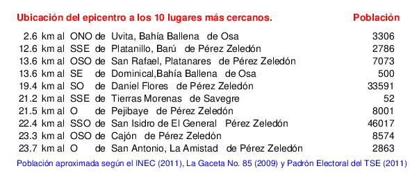 Detalle de la zona epicentral:. Se muestran los poblados más cercanos al epicentro en un radio de unos 30 km. Las principales fallas activas son las trazas de color rojo. Abajo están las distancias que hay del epicentro a cada uno de los diez sitios más cercanos y la cantidad de habitantes que poseen.