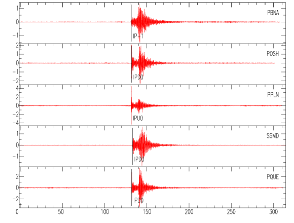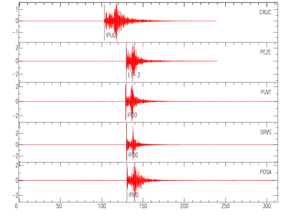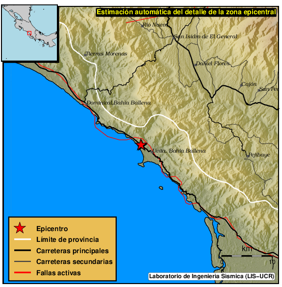 Mapa del epicentro: Los triángulos verdes son las estaciones acelerográficas usadas para calcular el epicentro que se muestra como un punto amarillo. El detalle de la magnitud y distancia a San José se muestra en el cuadro inserto en el mapa.