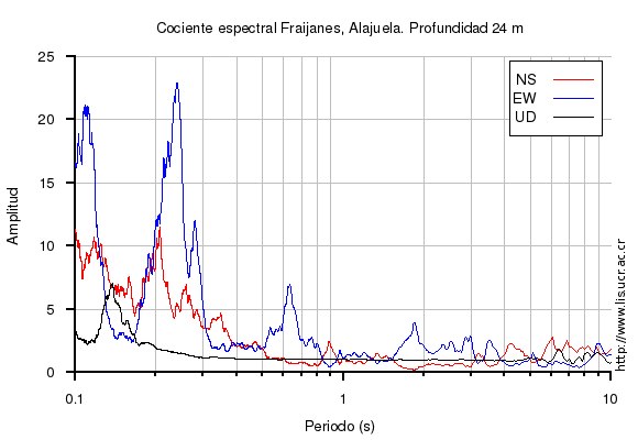 El cociente espectral se obtuvo dividiendo el espectro de amplitud de la componente en superficie con respecto a la componente en profundidad (NS=norte-sur, EW=este-oeste, UD=vertical)