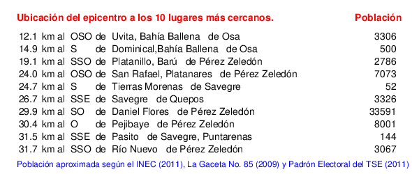 Detalle de la zona epicentral:. Se muestran los poblados más cercanos al epicentro en un radio de unos 30 km. Las principales fallas activas son las trazas de color rojo. Abajo están las distancias que hay del epicentro a cada uno de los diez sitios más cercanos y la cantidad de habitantes que poseen.