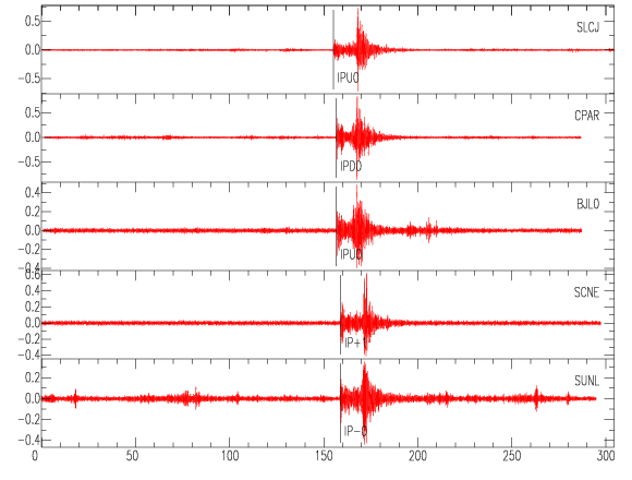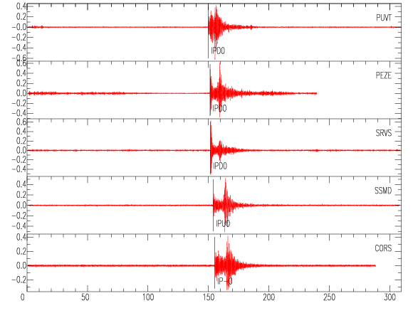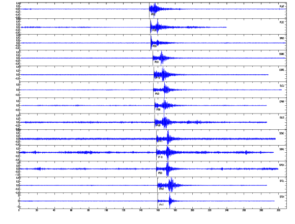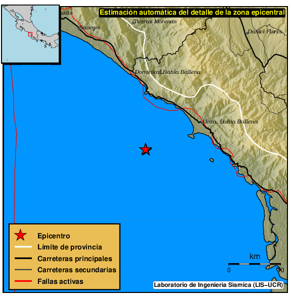Mapa del epicentro: Los triángulos verdes son las estaciones acelerográficas usadas para calcular el epicentro que se muestra como un punto amarillo. El detalle de la magnitud y distancia a San José se muestra en el cuadro inserto en el mapa.