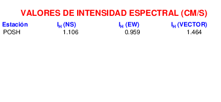 En esta sección se muestra el cáculo de la intensidad de Housner, IH para la componente norte-sur (NS) y este-oeste (EW) y la suma vectorial de los registros de aceleración que tuvieron valores superiores a los 5 cm/s2.