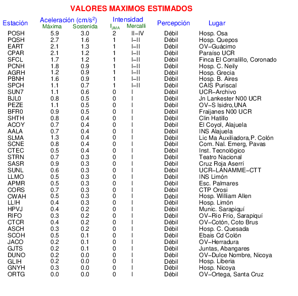 La siguiente tabla muestra los valores de Aceleración Máxima o aceleración pico (PGA por sus siglas en inglés). Este es el valor máximo en cualquiera de las 3 componentes del registro.