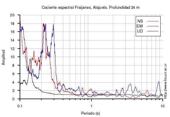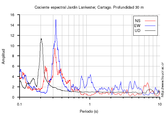 El cociente espectral se obtuvo dividiendo el espectro de amplitud de la componente en superficie con respecto a la componente en profundidad (NS=norte-sur, EW=este-oeste, UD=vertical)