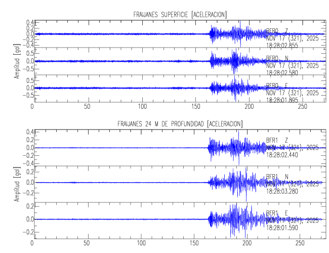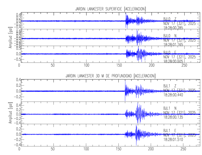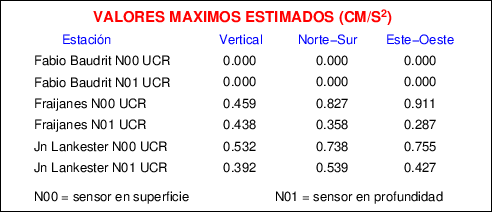 Aquí se muestran las formas de onda y cocientes espectrales de los sensores colocados en pozo . Uno se ubica en el Jardín Lankester en Paraíso de Cartago con 30 m de profundidad y el otro en la Estación Experimental Fabio Baudrit en Alajuela con 40 m de profundidad. La tabla muestra los valores de aceleración máxima (PGA) leídos de las tres componentes en superficie (N00) y en profundidad (N01)