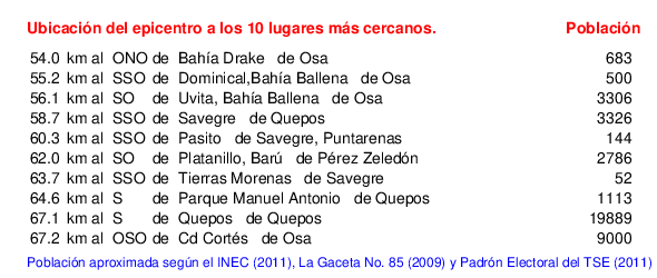 Detalle de la zona epicentral:. Se muestran los poblados más cercanos al epicentro en un radio de unos 30 km. Las principales fallas activas son las trazas de color rojo. Abajo están las distancias que hay del epicentro a cada uno de los diez sitios más cercanos y la cantidad de habitantes que poseen.