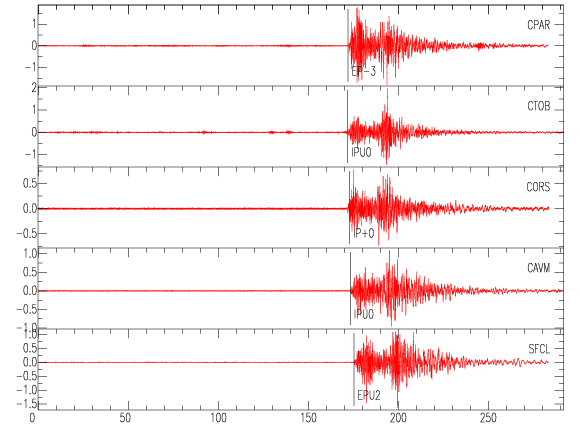 Mapa del epicentro: Los triángulos verdes son las estaciones acelerográficas usadas para calcular el epicentro que se muestra como un punto amarillo. El detalle de la magnitud y distancia a San José se muestra en el cuadro inserto en el mapa.