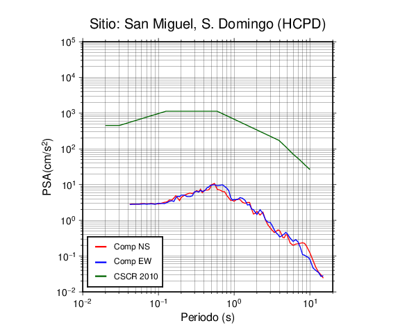 En los siguientes gráficos, la traza verde es el espectro propuesto por el CSCR-2010, la traza roja es el espectro de este sismo en la componente norte-sur (NS) y la traza azul la componente este-oeste (EW). El valor de la amplitud está dado en pseudoaceleración en cm/s2.