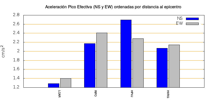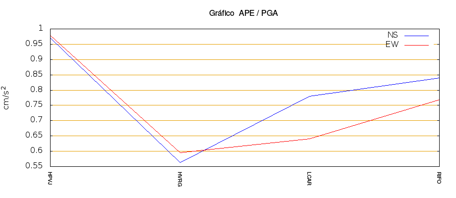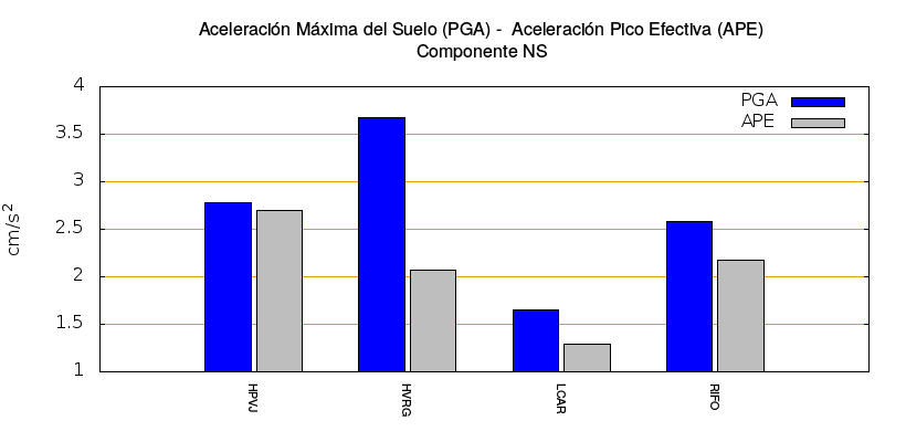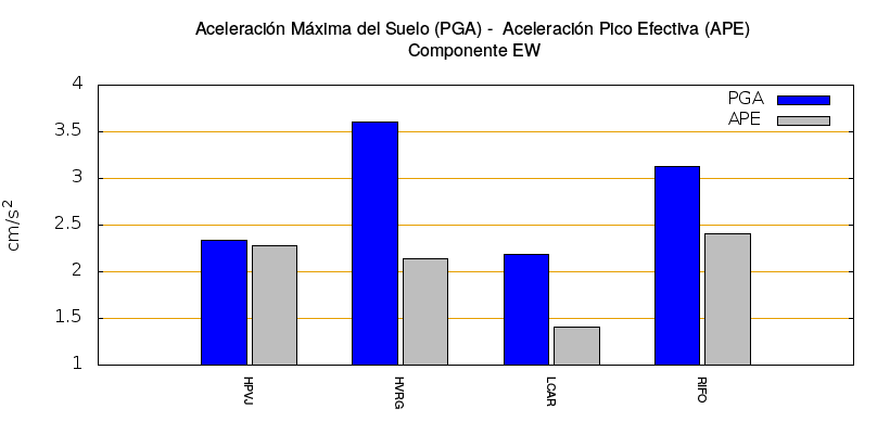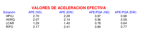 La siguiente tabla muestra los valores de aceleración efectiva para las componentes norte-sur (NS) y este-oeste (EW). También se muestra el valor del cociente entre la aceleración efectiva y la aceleración máxima (APE/PGA).