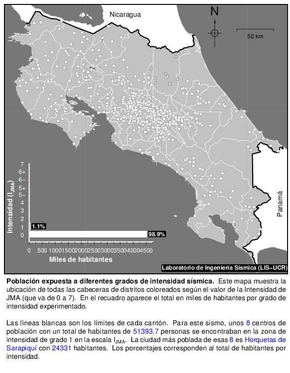 Cada punto sobre el mapa es la cabecera de un distrito. El número de habitantes que hay en cada uno se suma si se encuentra dentro de una misma zona de intensidad sísmica y el total se muestra en el recuadro en manera de porcentajes del total de la población y en miles de habitantes.