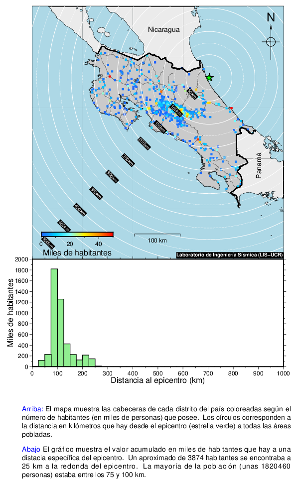 Este mapa muestra la ubicación del epicentro y la cantidad de habitantes que se encontraban a una cierta distancia de este. Los intervalos son de 25 km.