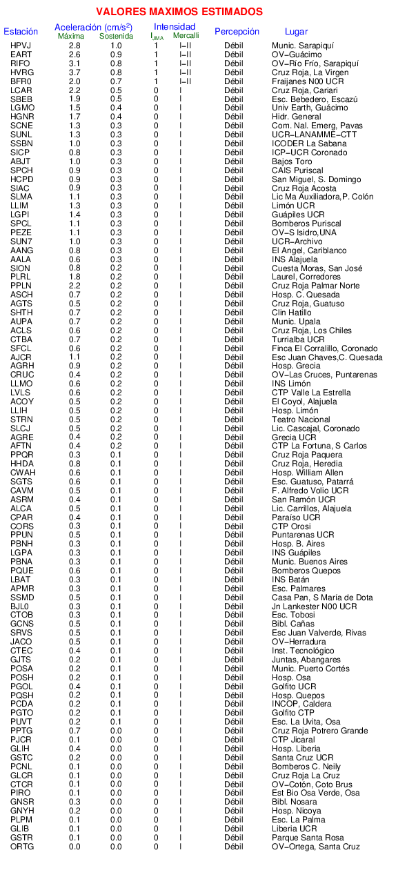 La siguiente tabla muestra los valores de Aceleración Máxima o aceleración pico (PGA por sus siglas en inglés). Este es el valor máximo en cualquiera de las 3 componentes del registro.