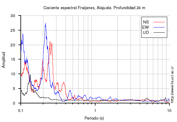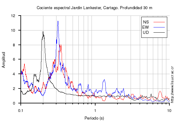 El cociente espectral se obtuvo dividiendo el espectro de amplitud de la componente en superficie con respecto a la componente en profundidad (NS=norte-sur, EW=este-oeste, UD=vertical)