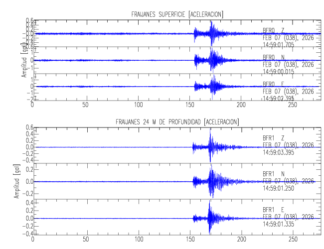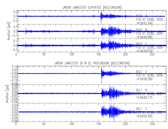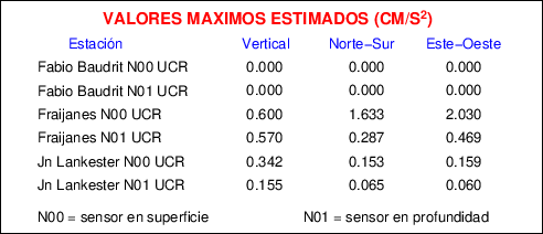 Aquí se muestran las formas de onda y cocientes espectrales de los sensores colocados en pozo . Uno se ubica en el Jardín Lankester en Paraíso de Cartago con 30 m de profundidad y el otro en la Estación Experimental Fabio Baudrit en Alajuela con 40 m de profundidad. La tabla muestra los valores de aceleración máxima (PGA) leídos de las tres componentes en superficie (N00) y en profundidad (N01)