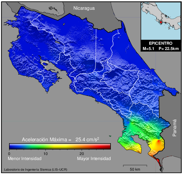 Los datos de aceleración máxima registrada se interpolan para obtener un mapa de isoaceleraciones. En el se puede ver la tendencia general de la amplificación de todo el país a partir del lugar en que el movimiento fue más intenso.