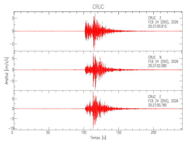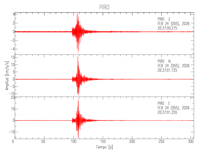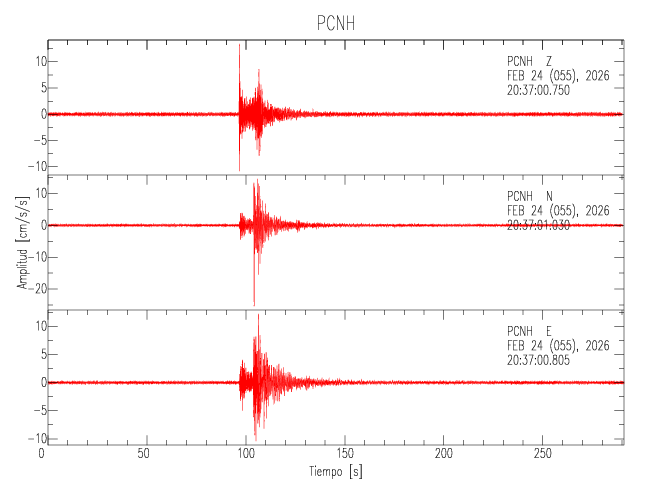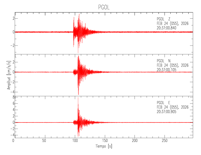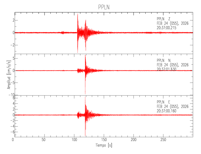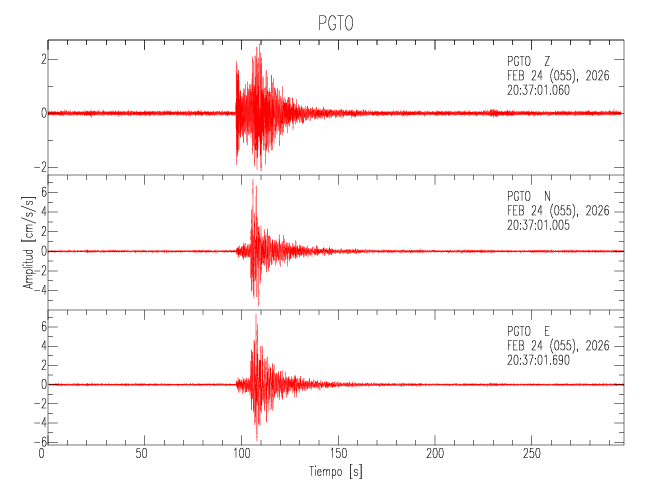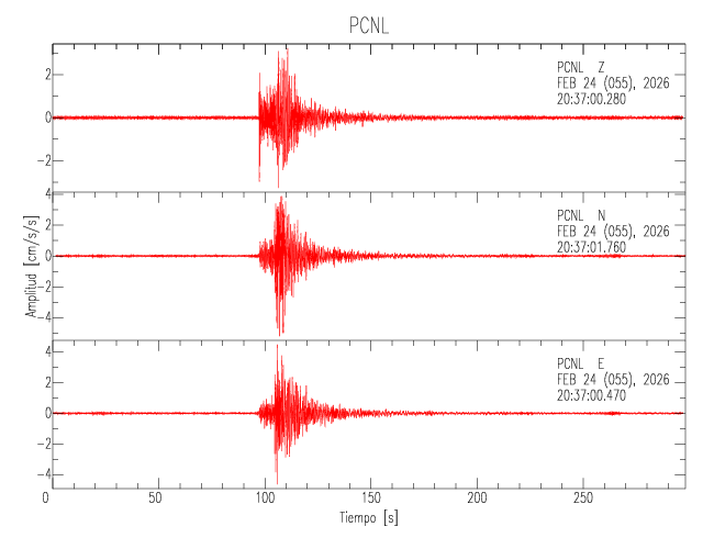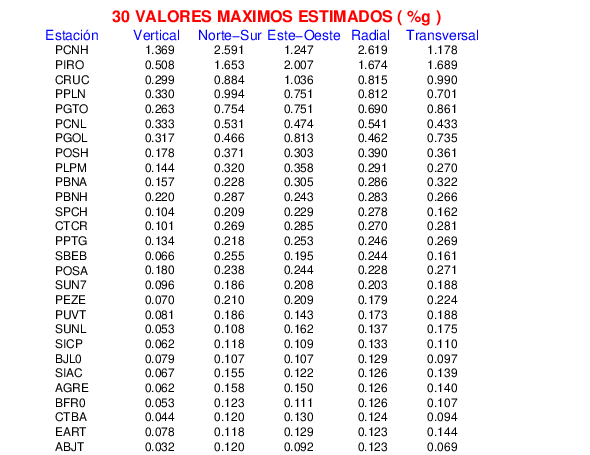 La siguiente tabla muestra los datos de aceleración máxima para cada componente en porcentaje de la aceleración de la gravedad (%g). Estos se obtienen dividiendo el valor del PGA registrado por 980 cm/s2 y multiplicándolo por 100. Los valores de las últimas dos columnas corresponden a la componente radial y transversal. Los datos se listan en orden descendente según el valor de la componente radial.