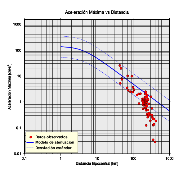 Datos del valor de la aceleración máxima (PGA por sus siglas en inglés) de cada estación (puntos rojos) en función de la distancia al hipocentro. Las trazas azules corresponden al modelo de atenuación y su respectiva desviación estándar.