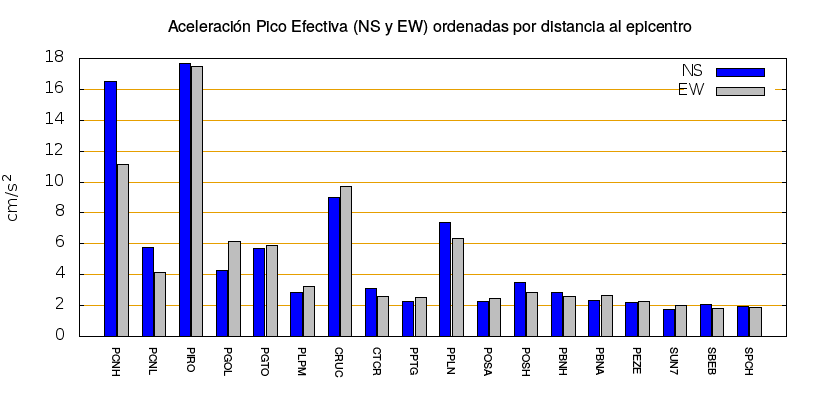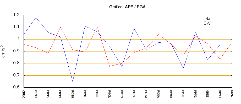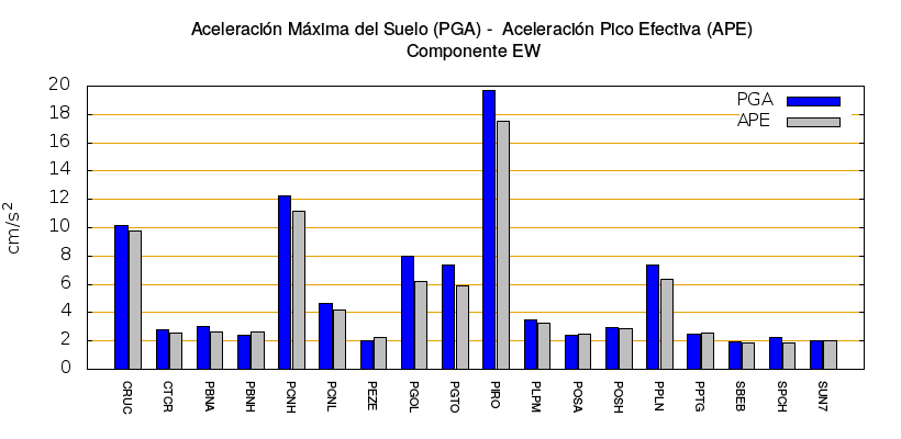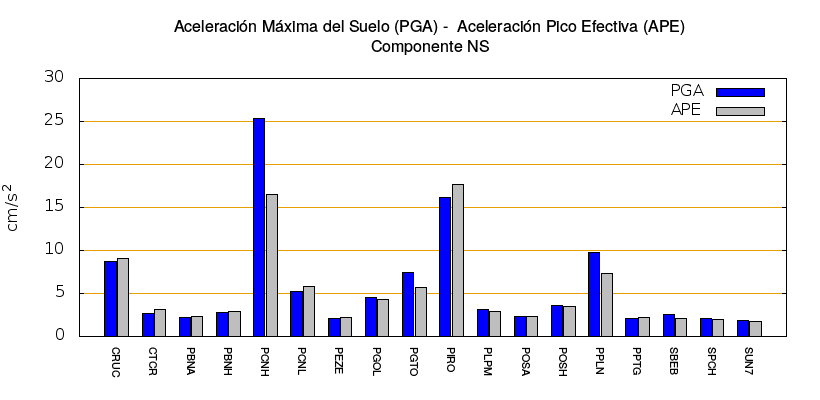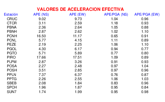 La siguiente tabla muestra los valores de aceleración efectiva para las componentes norte-sur (NS) y este-oeste (EW). También se muestra el valor del cociente entre la aceleración efectiva y la aceleración máxima (APE/PGA).