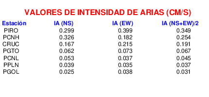 En esta sección se muestra el cáculo de la IA para la componente norte-sur (NS) y este-oeste (EW) de los registros de aceleración que tuvieron valores superiores a los 5 cm/s2, así como el valor total de esta que corresponde al promedio de ambas componentes horizontales.
