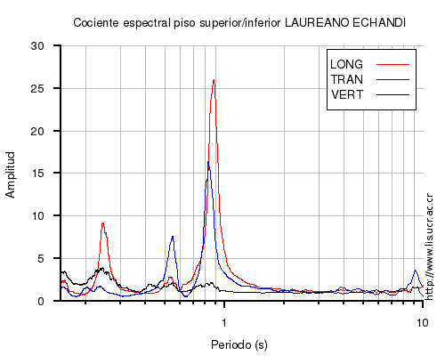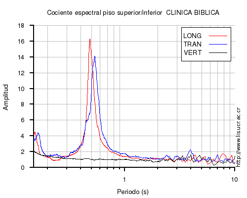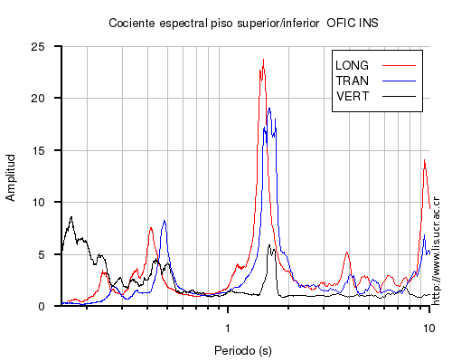 También se muestra el cociente espectral (en el rango de 0.1 a 10 s) entre el nivel superior (sea el último piso o la azotea) e inferior (sea el primero piso o el sótano) para cada una de las componentes LONG=longitudinal, TRAN=transversal y VERT=vertical. En los casos en que el nivel superior o inferior no estén disponibles al momento del sismo, se muestra una imagen con la leyenda "No se pudo calcular".