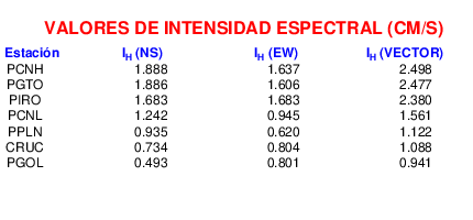 En esta sección se muestra el cáculo de la intensidad de Housner, IH para la componente norte-sur (NS) y este-oeste (EW) y la suma vectorial de los registros de aceleración que tuvieron valores superiores a los 5 cm/s2.
