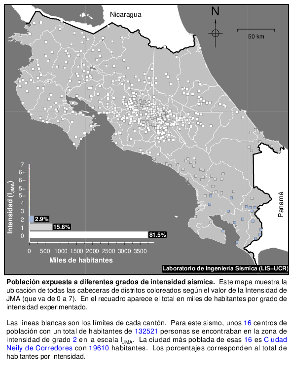 Cada punto sobre el mapa es la cabecera de un distrito. El número de habitantes que hay en cada uno se suma si se encuentra dentro de una misma zona de intensidad sísmica y el total se muestra en el recuadro en manera de porcentajes del total de la población y en miles de habitantes.