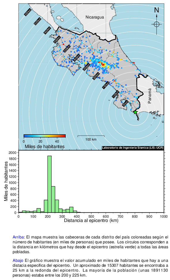 Este mapa muestra la ubicación del epicentro y la cantidad de habitantes que se encontraban a una cierta distancia de este. Los intervalos son de 25 km.