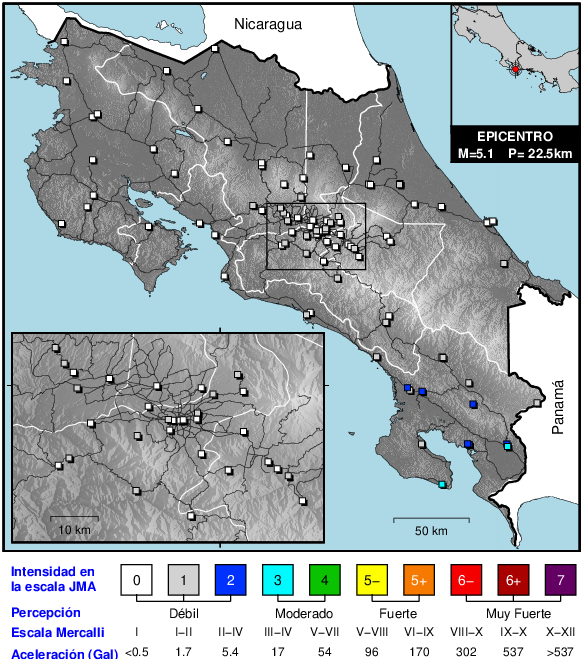 La escala de intensidad sísmica desarrollada por la Agencia Meteorológica de Japón (JMA) describe el grado de agitación en un punto de la superficie terrestre. Se calcula a partir de las tres componentes de un registro de aceleración y de la duración de la sacudida. La escala varía de 0 a 7, donde 0 es un movimiento imperceptible y 7 corresponde a un terremoto destructivo.