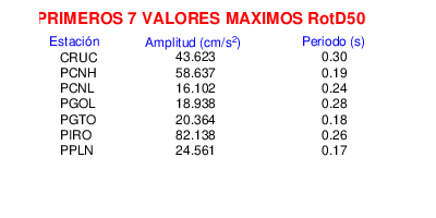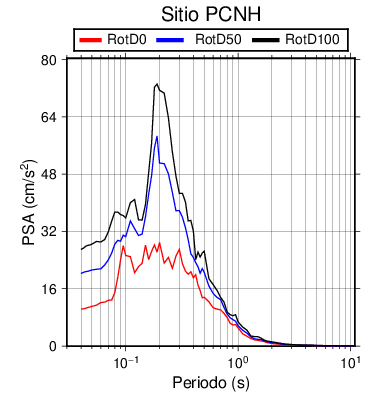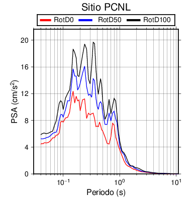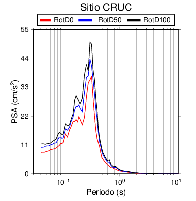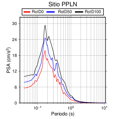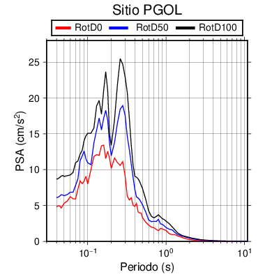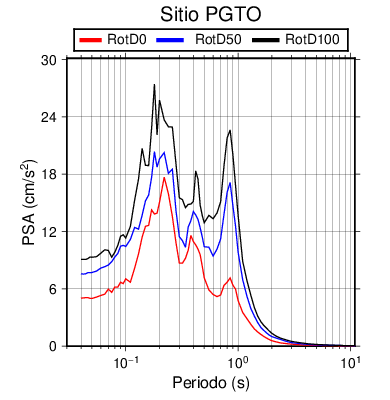 RotD50 representa un valor medio de la respuesta por lo cual se puede comparar con valores de otras medidas empleadas en modelos de atenuación como la Media Geométrica de las componentes ortogonales (GM). RotD0 y RotD100 son los valores extremos (mínimo y máximo), los cuales nos pueden servir para determinar la dispersión de la posible respuesta en cada sitio.