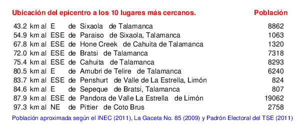 Detalle de la zona epicentral:. Se muestran los poblados más cercanos al epicentro en un radio de unos 30 km. Las principales fallas activas son las trazas de color rojo. Abajo están las distancias que hay del epicentro a cada uno de los diez sitios más cercanos y la cantidad de habitantes que poseen.