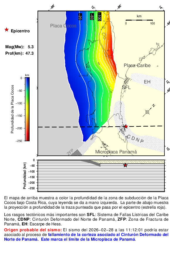 Origen del sismo: Este mapa muestra el marco tectónico de Costa Rica. El mapa se ha rotado para que el corte horizontal (línea punteada que corta el epicentro) que se muestra sobre el mapa se proyecte de manera proporcional en la figura de abajo. Los diferentes colores corresponden a la profundidad de la Placa Cocos bajo la Placa Caribe.
