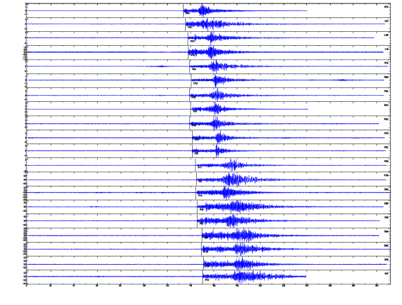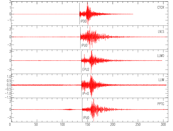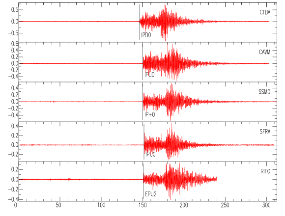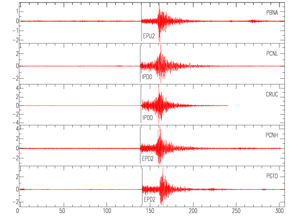 Mapa del epicentro: Los triángulos verdes son las estaciones acelerográficas usadas para calcular el epicentro que se muestra como un punto amarillo. El detalle de la magnitud y distancia a San José se muestra en el cuadro inserto en el mapa.