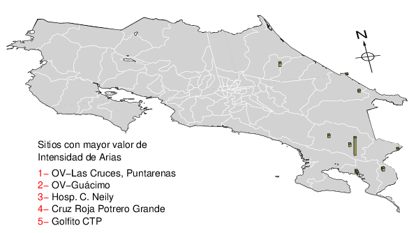 Mapa mostrando la IA en cada sitio de registro. Se grafica el valor máximo de la tabla anterior.
