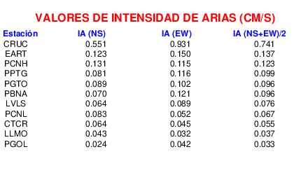 En esta sección se muestra el cáculo de la IA para la componente norte-sur (NS) y este-oeste (EW) de los registros de aceleración que tuvieron valores superiores a los 5 cm/s2, así como el valor total de esta que corresponde al promedio de ambas componentes horizontales.