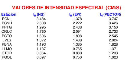 En esta sección se muestra el cáculo de la intensidad de Housner, IH para la componente norte-sur (NS) y este-oeste (EW) y la suma vectorial de los registros de aceleración que tuvieron valores superiores a los 5 cm/s2.