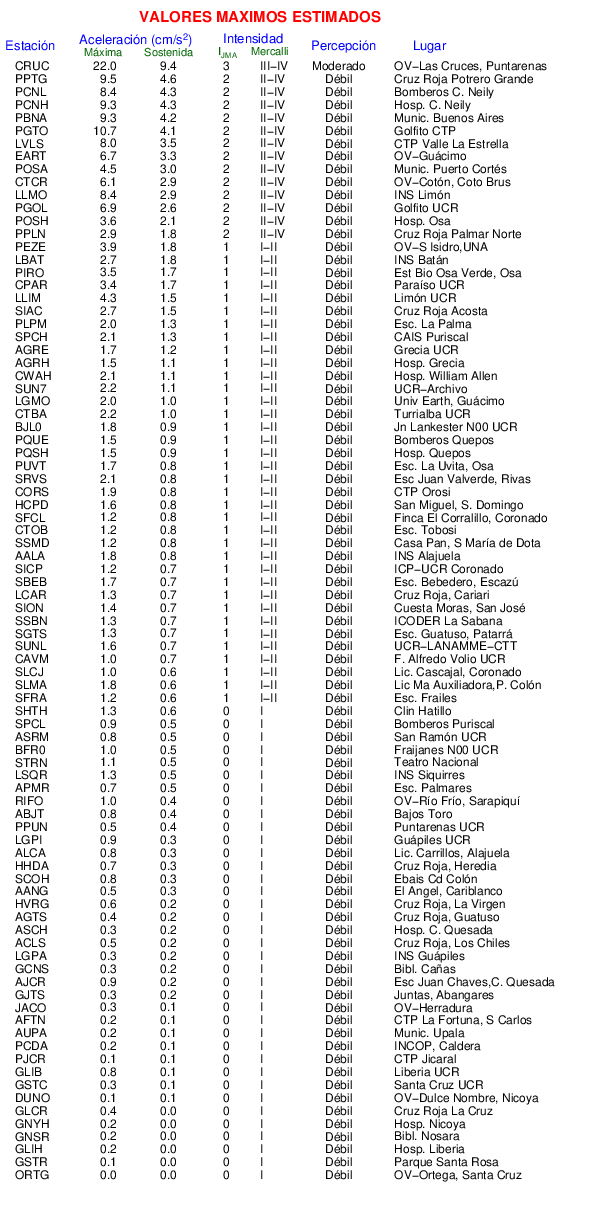 La siguiente tabla muestra los valores de Aceleración Máxima o aceleración pico (PGA por sus siglas en inglés). Este es el valor máximo en cualquiera de las 3 componentes del registro.