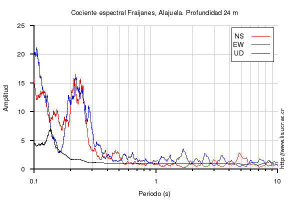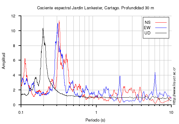 El cociente espectral se obtuvo dividiendo el espectro de amplitud de la componente en superficie con respecto a la componente en profundidad (NS=norte-sur, EW=este-oeste, UD=vertical)