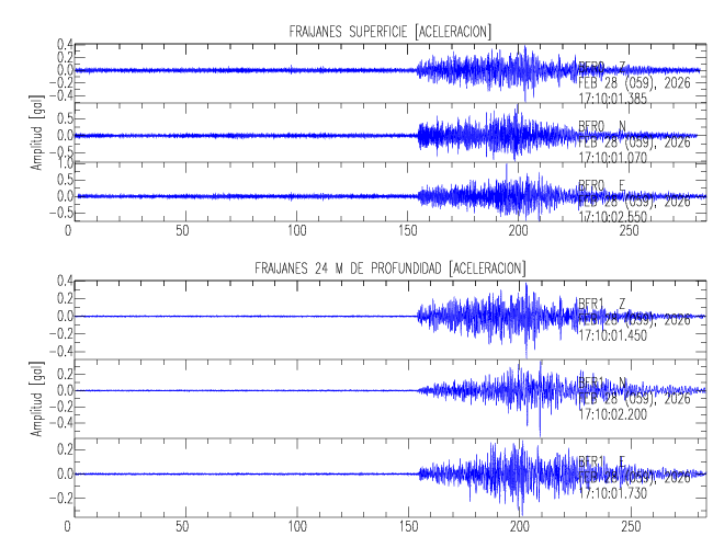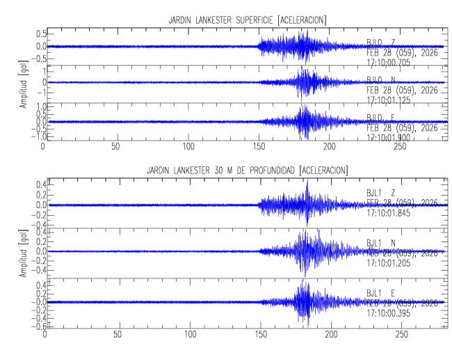 Aquí se muestran las formas de onda y cocientes espectrales de los sensores colocados en pozo . Uno se ubica en el Jardín Lankester en Paraíso de Cartago con 30 m de profundidad y el otro en la Estación Experimental Fabio Baudrit en Alajuela con 40 m de profundidad. La tabla muestra los valores de aceleración máxima (PGA) leídos de las tres componentes en superficie (N00) y en profundidad (N01)