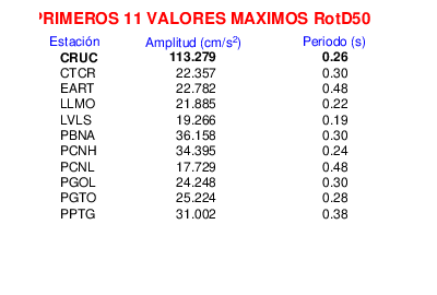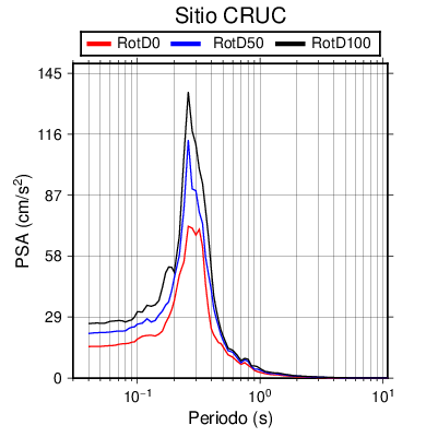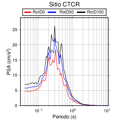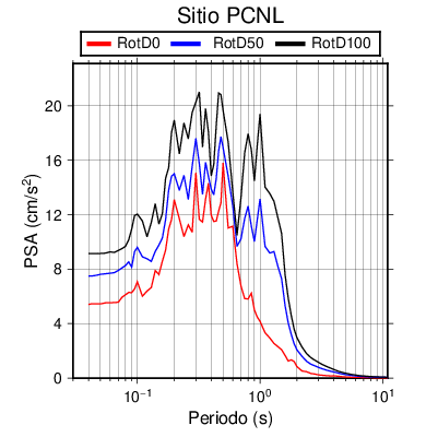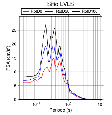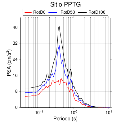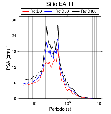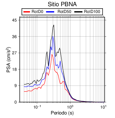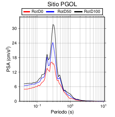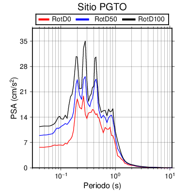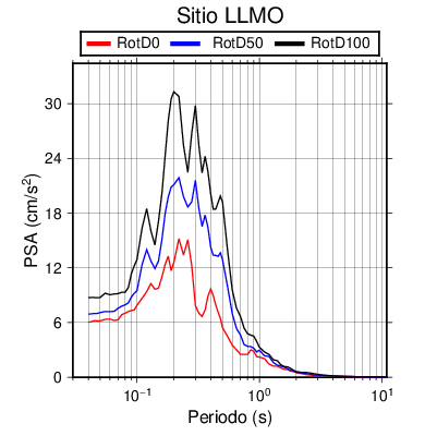 RotD50 representa un valor medio de la respuesta por lo cual se puede comparar con valores de otras medidas empleadas en modelos de atenuación como la Media Geométrica de las componentes ortogonales (GM). RotD0 y RotD100 son los valores extremos (mínimo y máximo), los cuales nos pueden servir para determinar la dispersión de la posible respuesta en cada sitio.