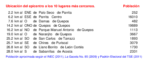 Detalle de la zona epicentral:. Se muestran los poblados más cercanos al epicentro en un radio de unos 30 km. Las principales fallas activas son las trazas de color rojo. Abajo están las distancias que hay del epicentro a cada uno de los diez sitios más cercanos y la cantidad de habitantes que poseen.